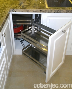 Một giải pháp lưu trữ tuyệt vời khác là một góc “thông minh” với kệ kéo. Sử dụng giải pháp lưu trữ tiện lợi này để tránh lãng phí không gian góc tủ, nơi bạn có thể giữ các loại xoong nồi lớn, các thiết bị nhỏ và các vật dụng cồng kềnh khác.