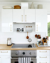 Nhà bếp này sử dụng một hốc nhỏ được tạo ra bởi sự thay đổi chiều sâu của bức tường để có một khu vực để các lọ gia vị. Một chiếc kệ nông phía dưới tủ bếp trên có thể là nơi tuyệt vời để cất giữ những món đồ nhỏ như lọ gia vị, cối xay hạt tiêu hay hộp trà.