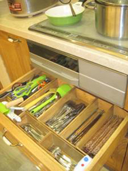 Ngăn kéo và sự sắp xếp bên trong từng khoang tủ đặc biệt quan trọng trong một nhà bếp nhỏ. Càng nhiều không gian lưu trữ càng tốt và hãy chia ngăn kéo thành nhiều ngăn nhỏ để bạn lưu trữ được nhiều hơn, hiệu quả hơn.