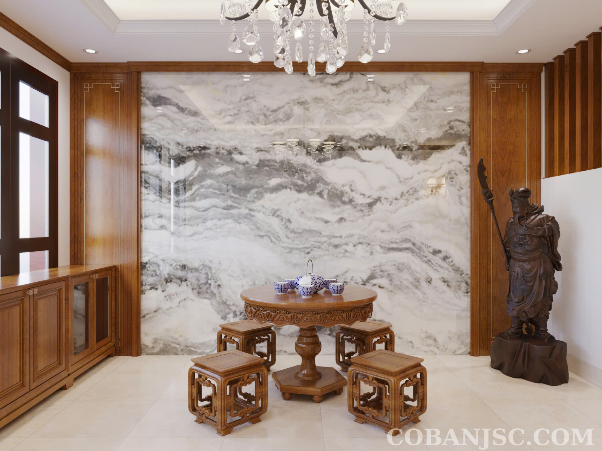 Thiết kế của căn nhà này là sự kết hợp một cách hài hòa giữa vẻ đẹp sang trọng, tinh tế của phong cách Tân Cổ Điển với nét ấm cúng, gần gũi và truyền thống của văn hóa Á Đông. Sự pha trộn này tạo nên một không gian sống độc đáo, vừa hiện đại, tiện nghi, vừa mang đậm bản sắc văn hóa.