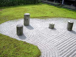 Khu vườn Shitenno-ji. Lưu ý bố cục ba tảng đá ở trung tâm.